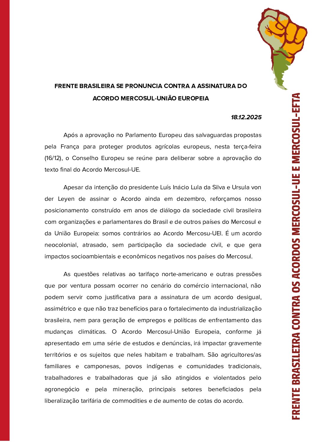 A carta evidencia como o latifúndio da celulose, amparado por governos e isenções ambientais, intensifica conflitos históricos por terra e água, deixando um rastro de violência e desigualdade. Mesmo diante da repressão, as retomadas quilombolas seguem firmes como alternativa de vida, dignidade e recuperação ambiental.