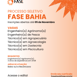 Está aberto processo seletivo na FASE Bahia para as seguintes vagas: Engenheiro(a) Agrônomo(a), Engenheiro(a) de Pesca, Técnico(a) em Agropecuária, Técnico(a) em Agroecologia, Técnico(a) em…