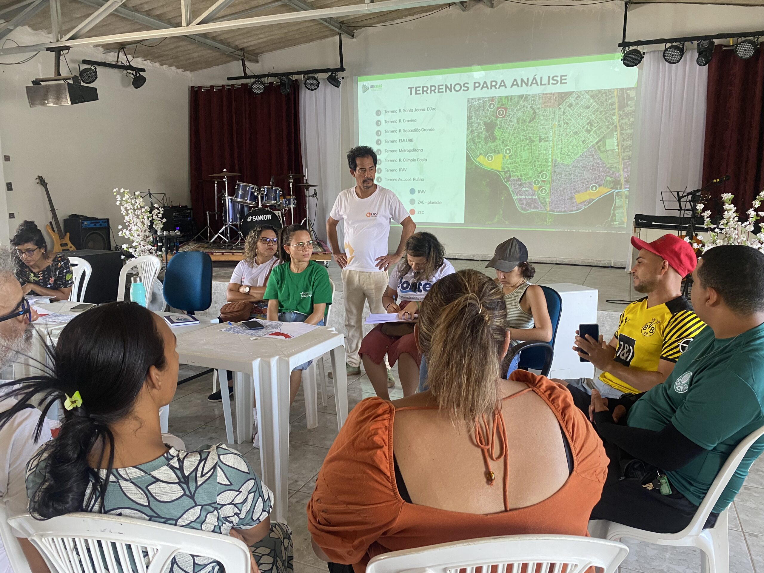 Após a definição das diretrizes, foram realizadas uma série de atividades para pensar coletivamente alternativas de reassentamento. Foram promovidas oficinas para reconhecer as demandas das famílias e as condições atuais de moradia no bairro, além de mutirões para identificar terrenos disponíveis na própria comunidade. Esses terrenos foram mapeados e analisados quanto à viabilidade técnica e legal. As atividades incluíram visitas de campo, seleção conjunta de três terrenos para estudos preliminares de arquitetura e urbanismo e, por fim, uma plenária comunitária para apresentar, debater e validar as propostas elaboradas.