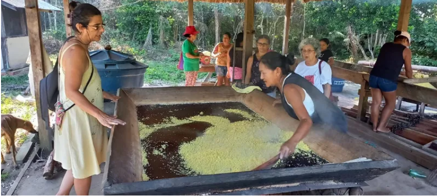 Pesquisadoras acompanham torra de farinha de mandioca na Comunidade São Francisco no PAE Lago Grande, no Pará / Acervo FASE