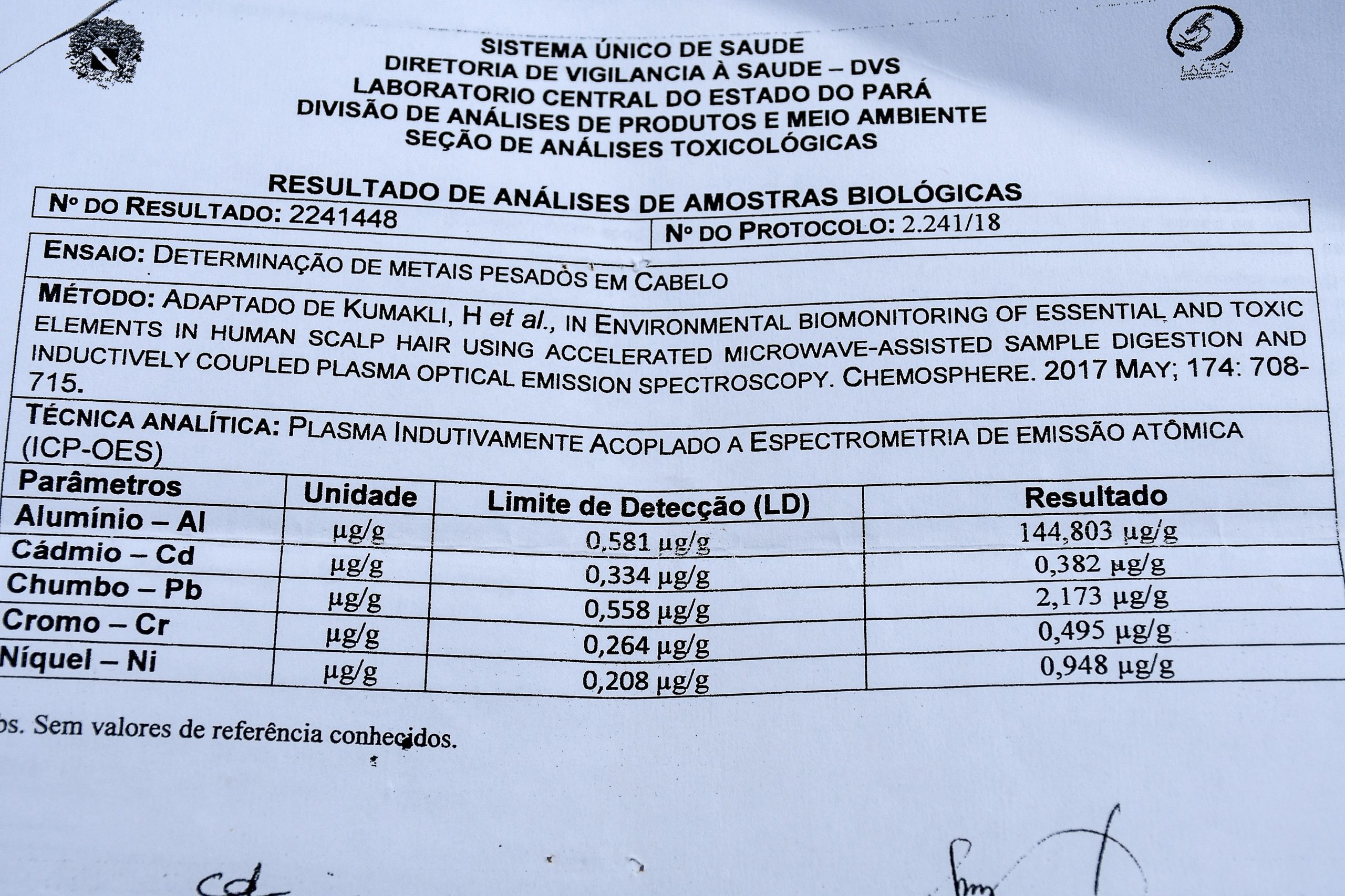 - Laudo com números alarmantes de níveis de metais pesados no corpo de um quilombola.