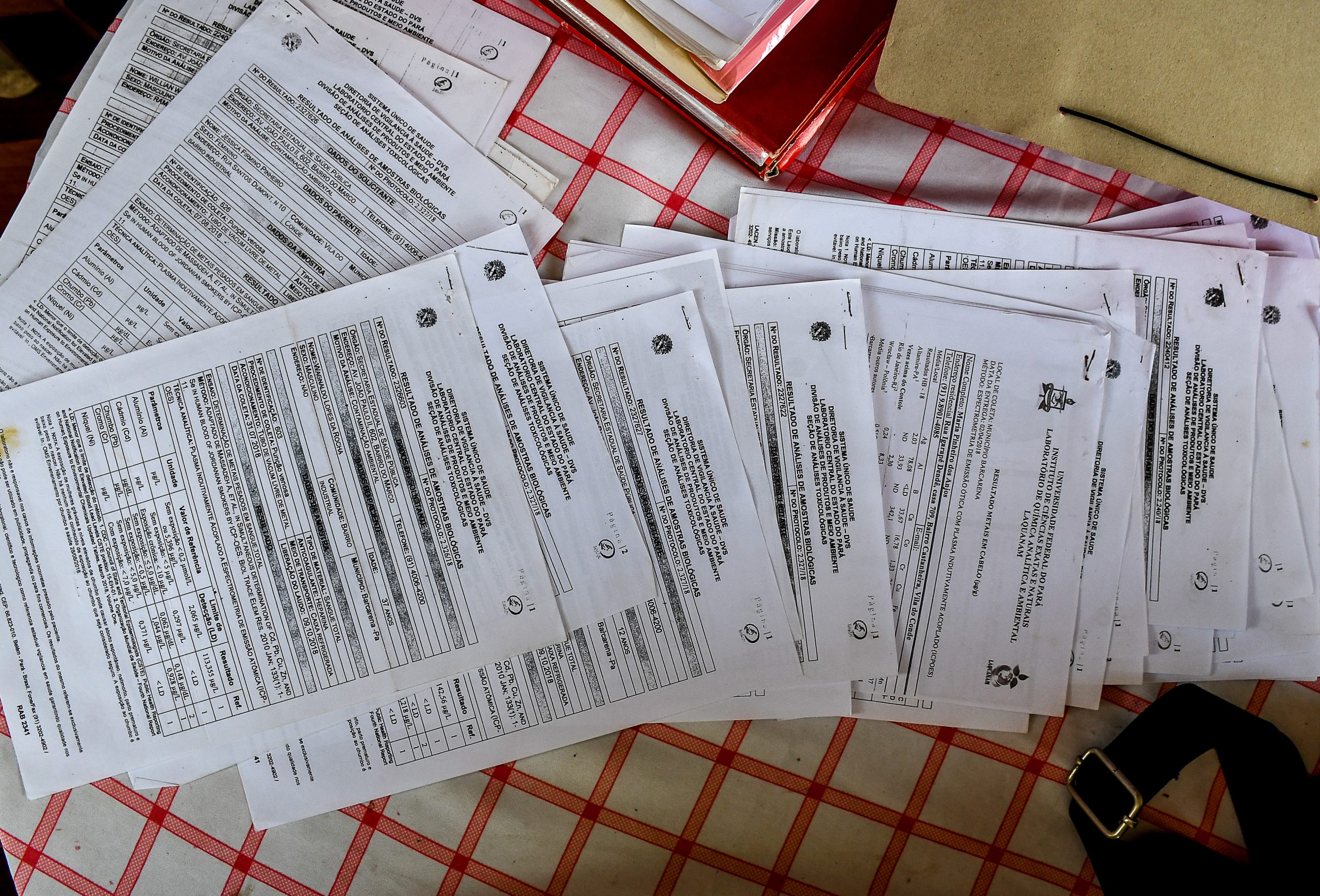 Apresentando dezenas de laudos médicos da comunidade, realizados pelo Instituto Evandro Chagas e pela UFPA, Socorro destaca os altos níveis de metais no organismo da população. “Os exames que nós fizemos em 2017, a Prefeitura e a Secretaria de Saúde não entregaram. Meu marido morreu sem receber o resultado do exame. As doenças existentes se complicaram e ele morreu sem saber o que tinha”, argumenta Socorro.
