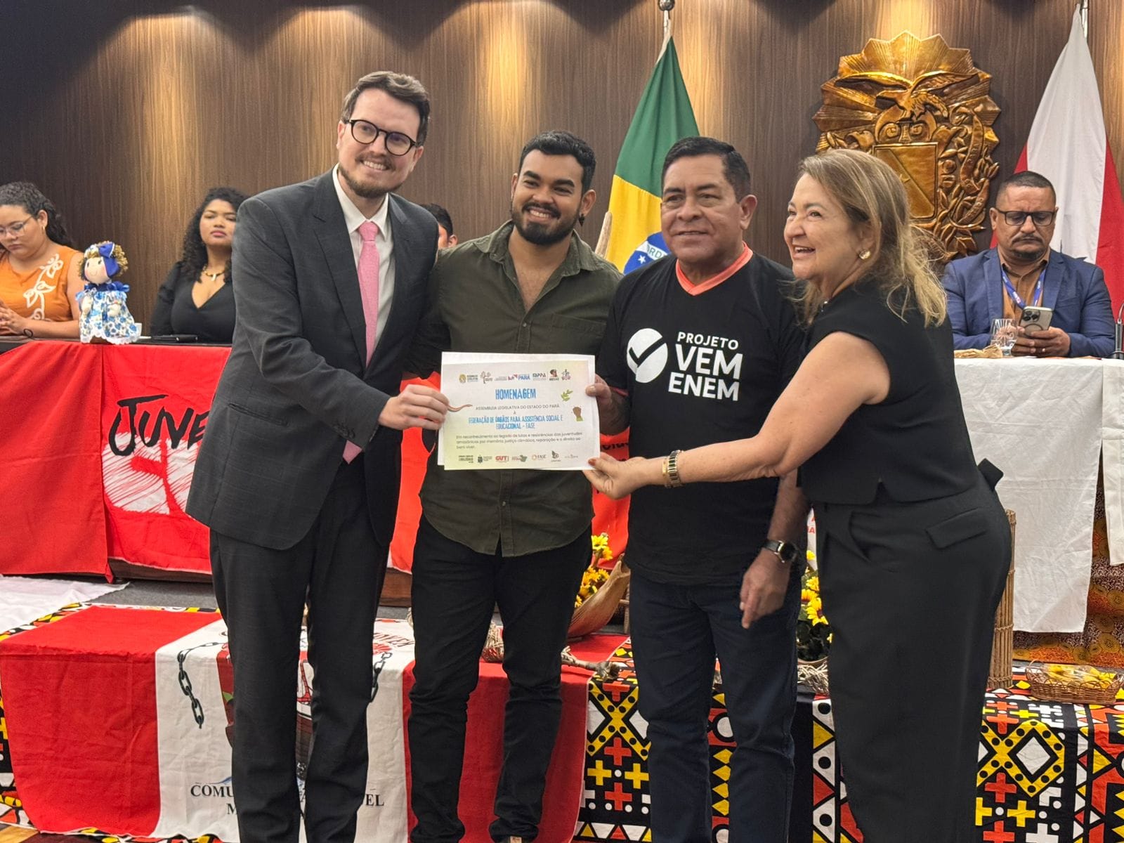 No último 11 de agosto, a Assembleia Legislativa do Estado do Pará (ALEPA) foi palco da Sessão Especial do Dia Internacional da Juventude, que este ano trouxe o tema “Juventude e Justiça Climática: vozes da Amazônia por direitos e bem viver”. A atividade foi uma iniciativa do presidente da Comissão de Direitos Humanos (CDH), construída coletivamente com a participação da FASE Amazônia e de outras organizações parceiras. O espaço se tornou um momento simbólico para reafirmar a força da juventude amazônica e, ao mesmo tempo, reconhecer a trajetória de luta das organizações que atuam junto a ela. Durante a sessão, a FASE Amazônia recebeu uma homenagem da ALEPA em reconhecimento ao legado de lutas e reexistências das juventudes amazônicas pela memória, pela justiça climática, pela reparação e pelo direito ao bem viver.