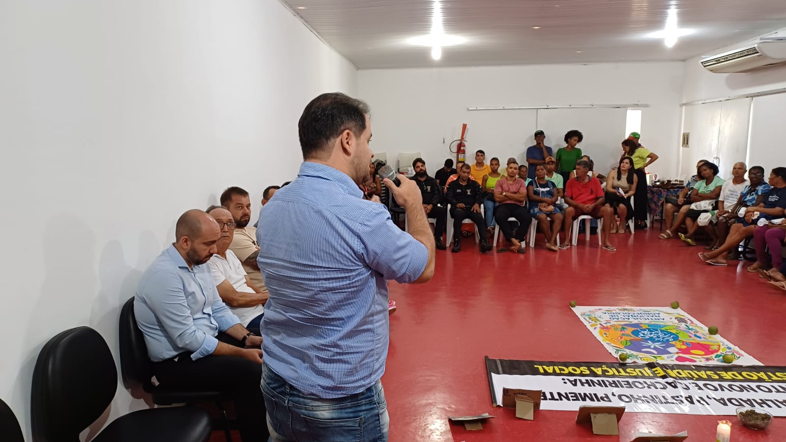 O promotor apresentou as ações do Ministério Público Estadual que têm sido feitas no combate ao desmatamento e controle do uso de agrotóxicos nos Territórios do Vale do Jiquiriçá e Baixo Sul. Ele falou sobre as leis de proteção ambiental e a importância da preservação do meio ambiente, bem como a liberdade e o cuidado com os animais silvestres. Em seguida, a professora Adriana mostrou as ações da Rede SOS Rio Jiquiriçá e como foi formado o grupo de articulação para combate à poluição do rio que banha o território do Vale do Jiquiriçá. Ela fez uma explanação sobre as estratégias e perspectivas da rede para enfrentamento das mudanças climáticas no Vale do Jiquiriçá.