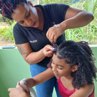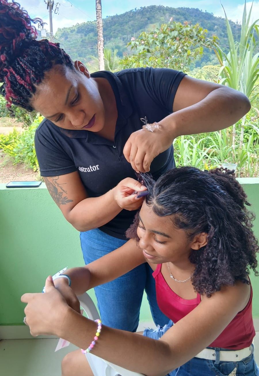 Já na comunidade do Fojo, a celebração ganhou um toque especial com a participação de voluntárias. A lash designer Gessica Silva, ofereceu atendimento gratuito de design de sobrancelhas, enquanto a trancista Luana Marques realizou penteados e compartilhou reflexões sobre a importância cultural das tranças, fortalecendo a autoestima e a identidade das participantes. Além disso, a FASE Bahia articulou atendimentos com a psicóloga Larissa Oliveira, que irá acompanhar, de forma voluntária, dez mulheres da comunidade.