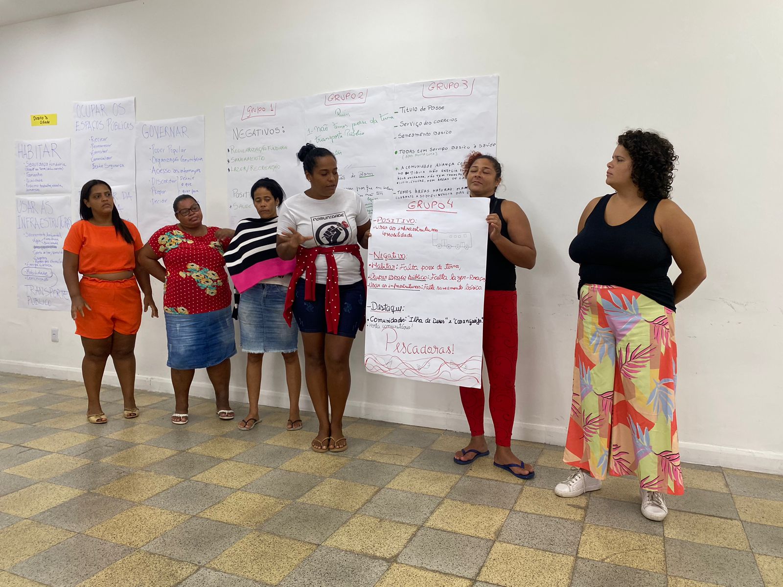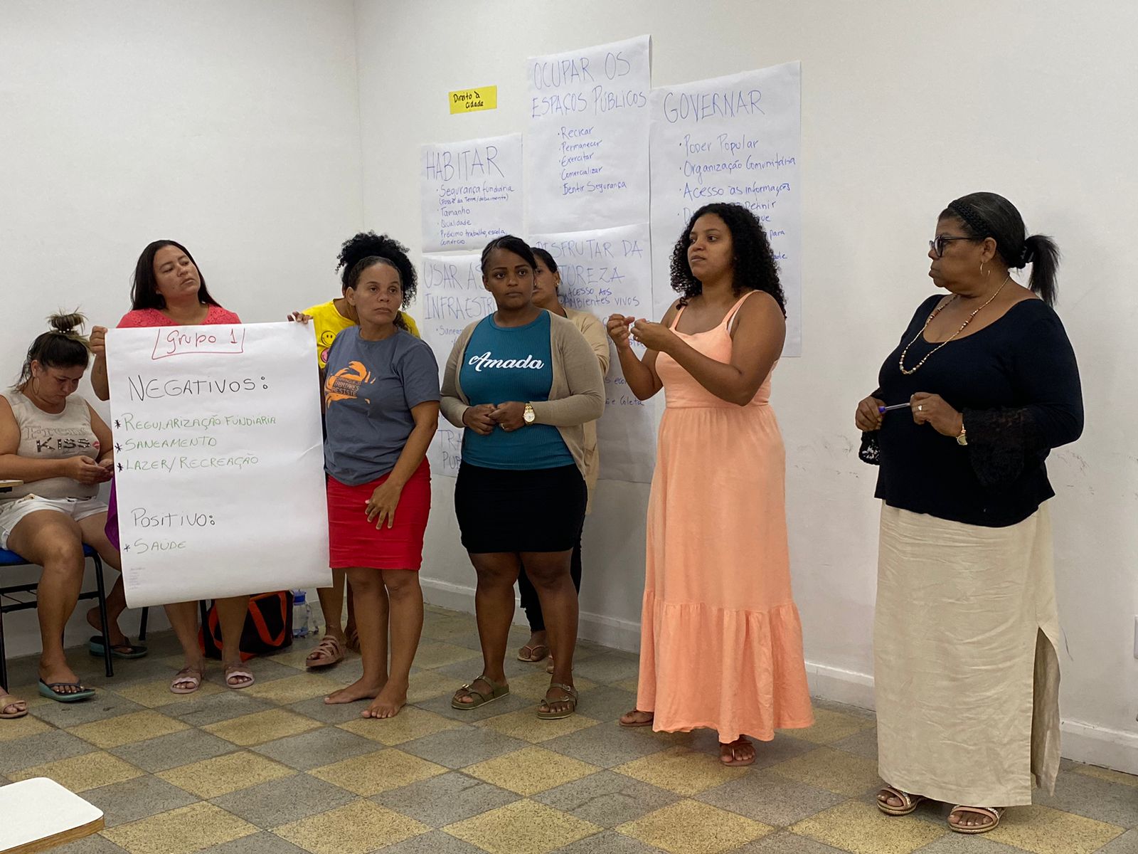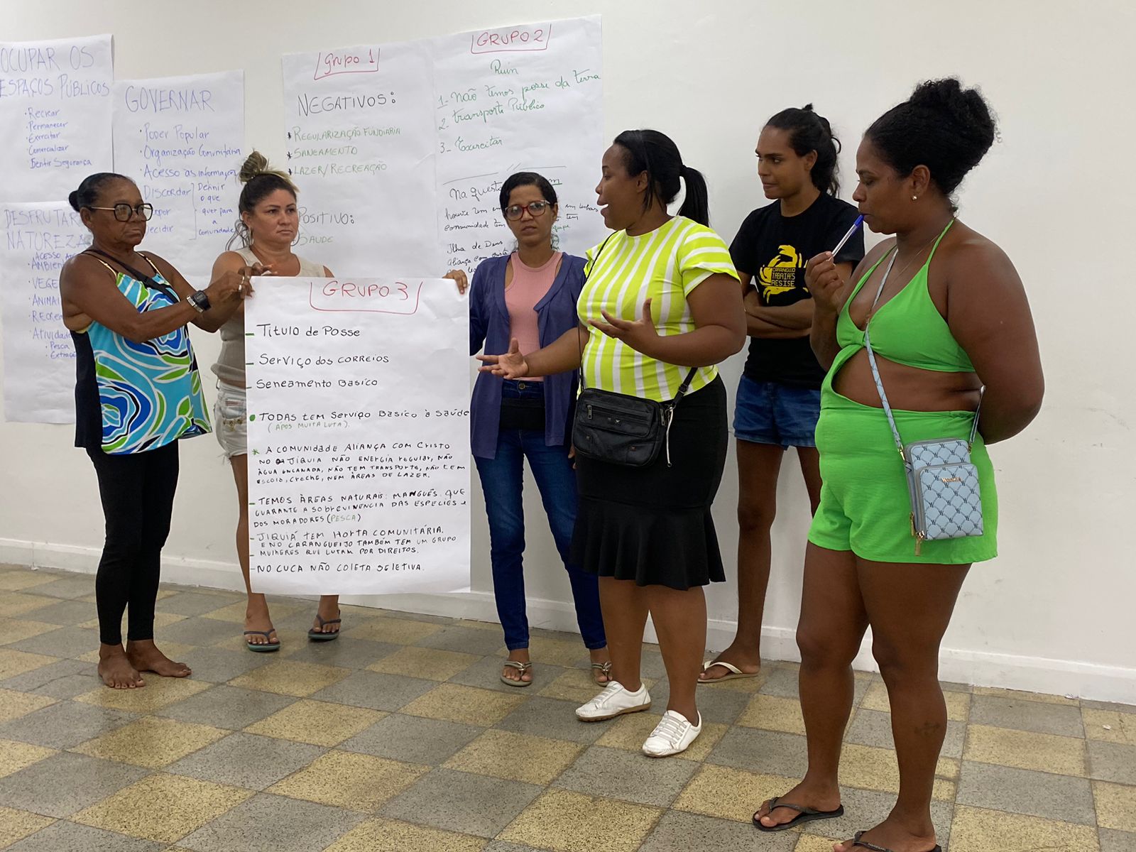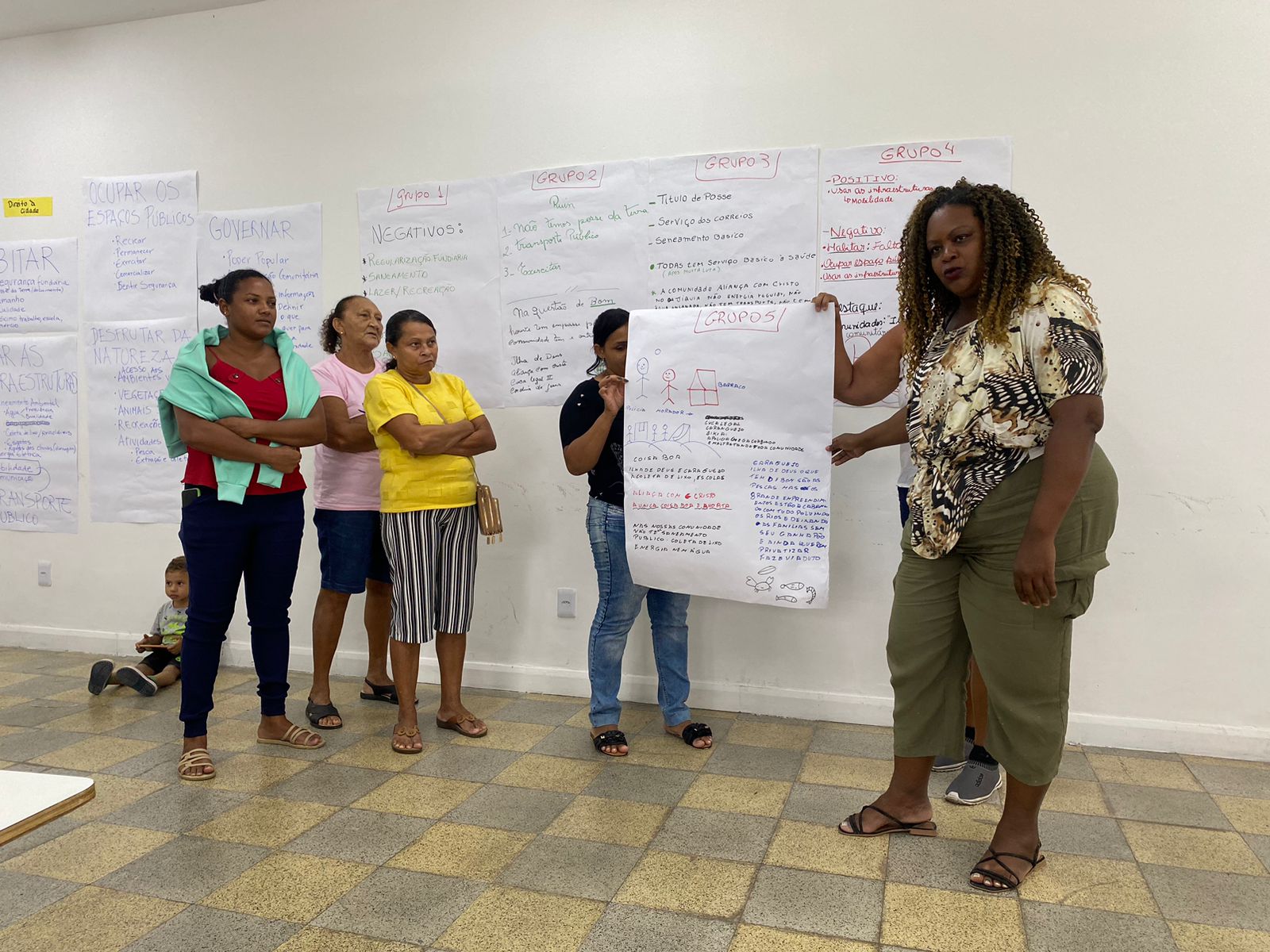Conectando essas experiências às suas realidades, as mulheres destacaram a Regularização Fundiária e os conflitos com os grandes empreendimentos imobiliários que resultam em despejos forçados dos seus locais de moradia. Luciene Maria, moradora da Ilha de Deus, compartilhou a preocupação com a falta de título de posse de sua casa, bem como a proximidade de um grande empreendimento comercial que ameaça sua comunidade.