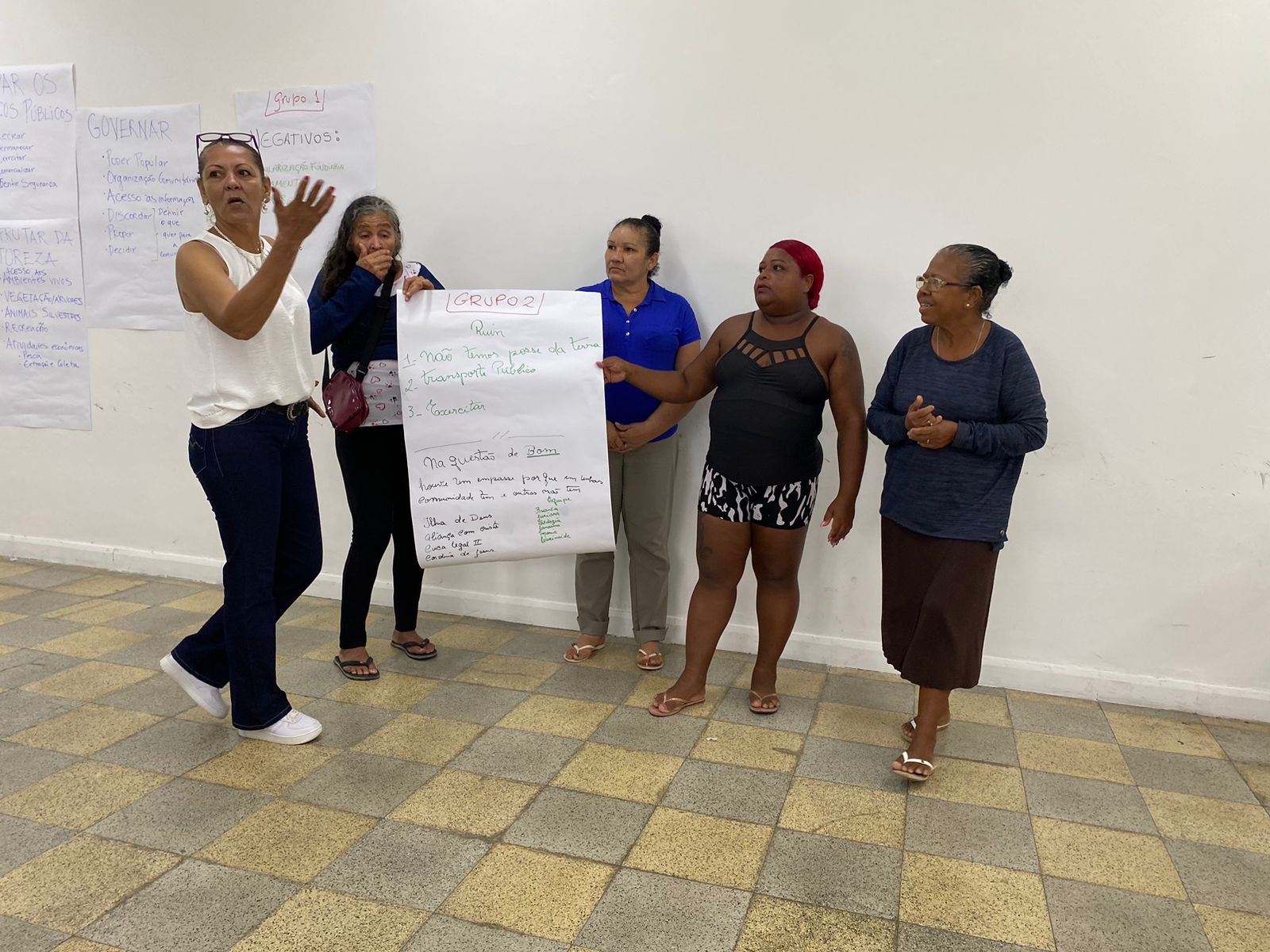 André Araripe, educador da FASE Pernambuco, enfatizou: “Habitar com segurança fundiária e qualidade; ter acesso integral às infraestruturas como saneamento; ocupar os espaços públicos para passear, comercializar, exercitar;, desfrutar da natureza e das suas riquezas; e a população ter a capacidade de governar. Quando isso é dado para todo mundo, nós vivemos em uma situação de justiça socioambiental”. A partir desses pontos, outras ausências como saneamento básico, transporte, equipamentos de lazer, escolas e creches foram apontadas pelas mulheres para exemplificar a falta de políticas públicas que garantam o bem-viver e a dignidade da população periférica.