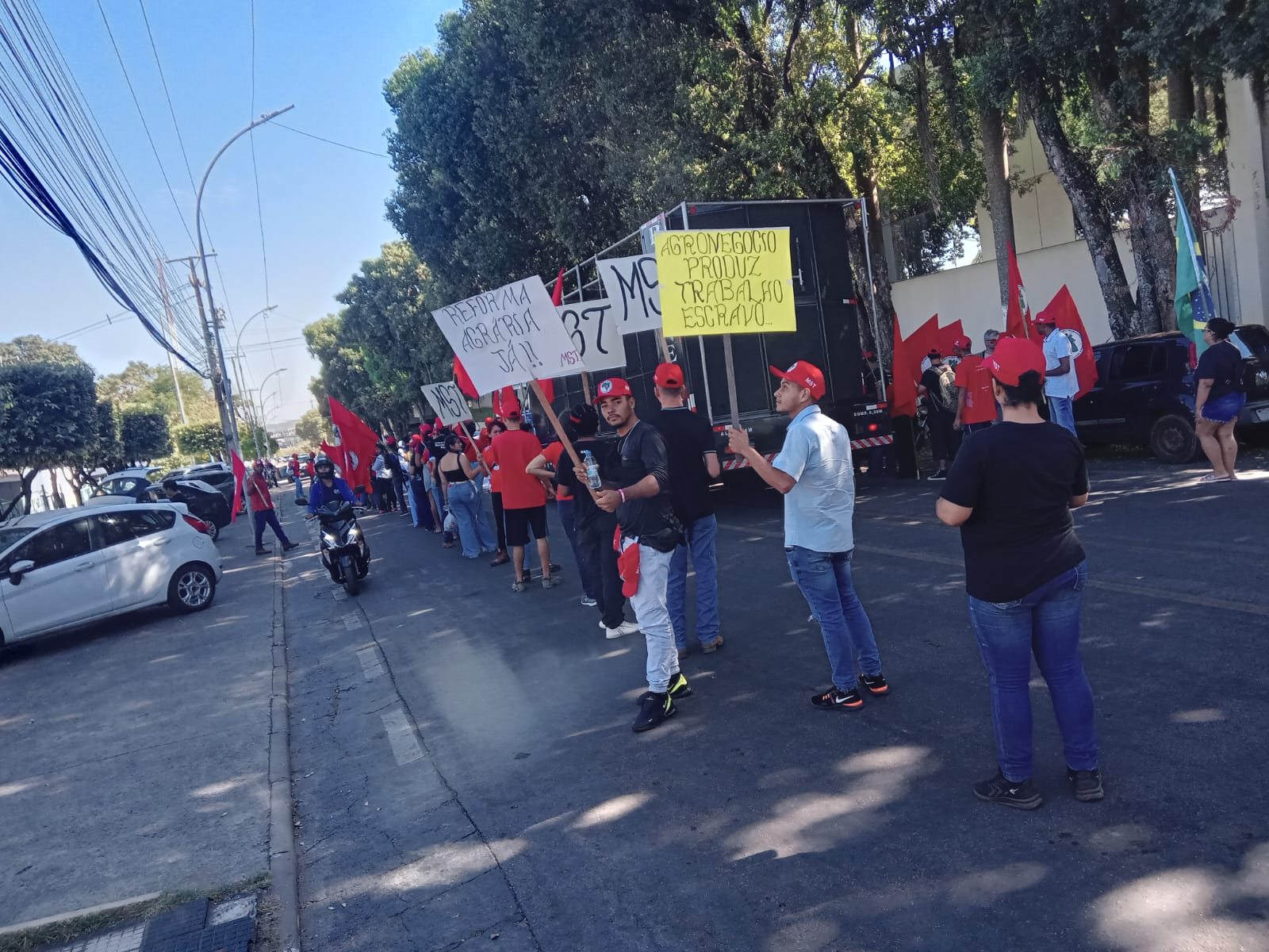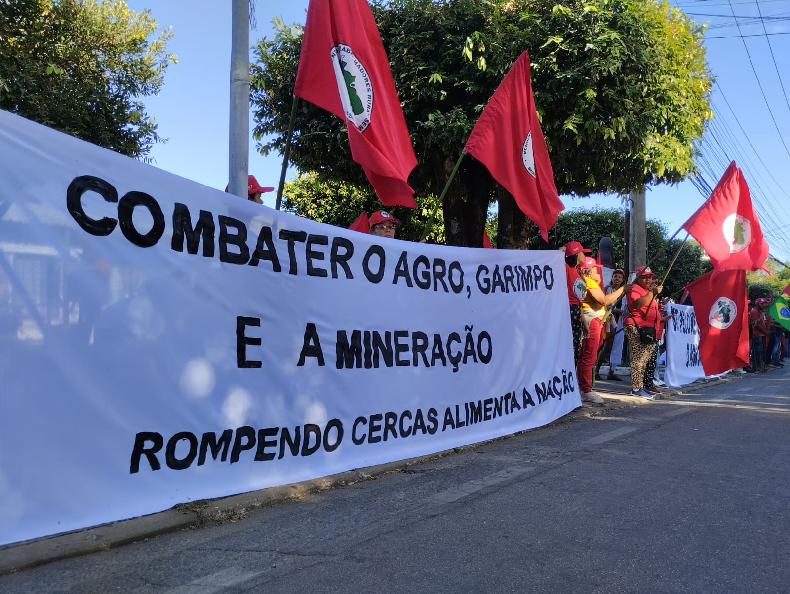 De acordo com Leonel Wohlfahrt, educador da FASE Mato Grosso, que participou do ato, a denúncia foi organizada na frente do palácio do governo, reunindo cerca de 130 manifestantes com o lema “Combater o agro, garimpo e a mineração – rompendo cercas alimenta a nação!”, e teve como alvo principal o governador Mauro Mendes e sua família que são donos de diversas empresas criminosas, acusadas de usar trabalho análogo à escravidão em Rondônia, casos de morte por condições inadequadas de trabalho, assédio moral, garimpo em área de preservação ambiental, bem como a invasão de terras quilombolas no Estado do Pará, além de diversos outros processos em andamento.