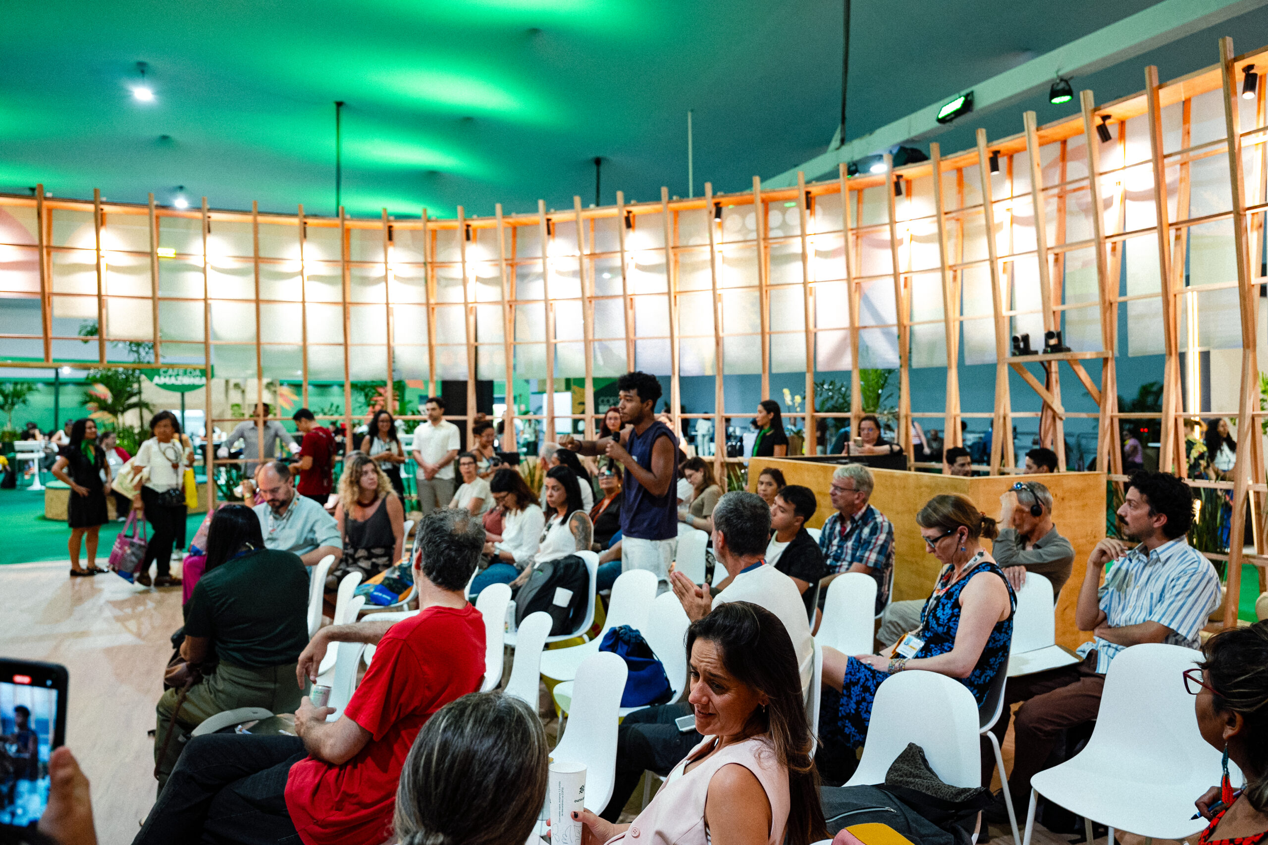 O debate aconteceu no salão Uruçu do Pavilhão Brasil, na Green zone, e participaram do painel Sheilla Dourado, do Inesc, Cássia Caneco, do Instituto Pólis e Thomas Bross, do Klima Brundnis (Ação Climática). A mediação do debate ficou a cargo de Yuri Rodrigues, educador da Fase Amazônia.