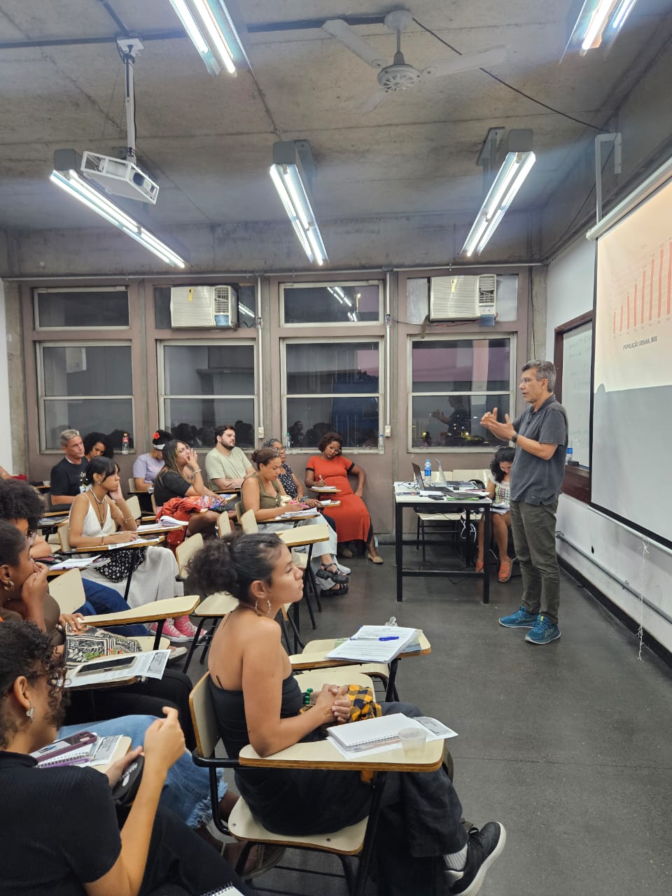 A aula inaugural contou com a participação de Aercio Barbosa, coordenador da FASE RJ, e Caroline Rodrigues, com o tema: “A construção da metrópole fluminense, a geografia do Rio de Janeiro e a vulnerabilidade às mudanças climáticas”. A primeira atividade contextualizou o curso e promoveu reflexões sobre os processos históricos e geográficos que moldaram a cidade do Rio, incluindo a história da ocupação da terra no Brasil, a construção dos grandes latifúndios e a lei das terras de 1850, além dos efeitos do sistema escravocrata no país.