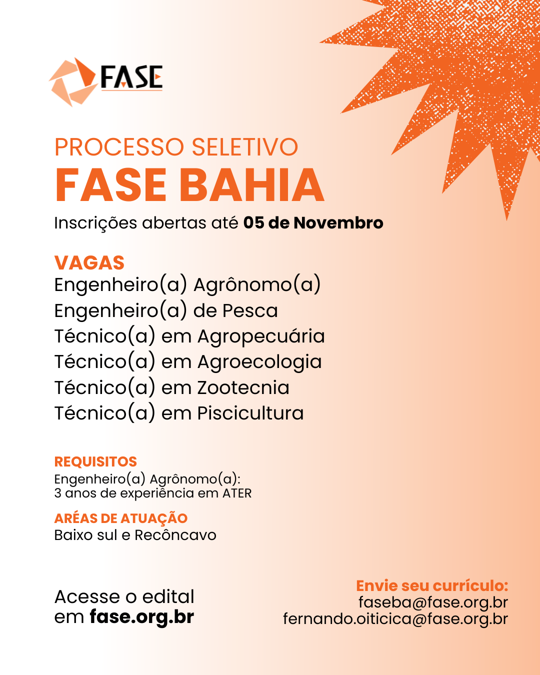 Envio de currículos até 05/11/2025 para: faseba@fase.org.br e fernando.oiticica@fase.org.br
