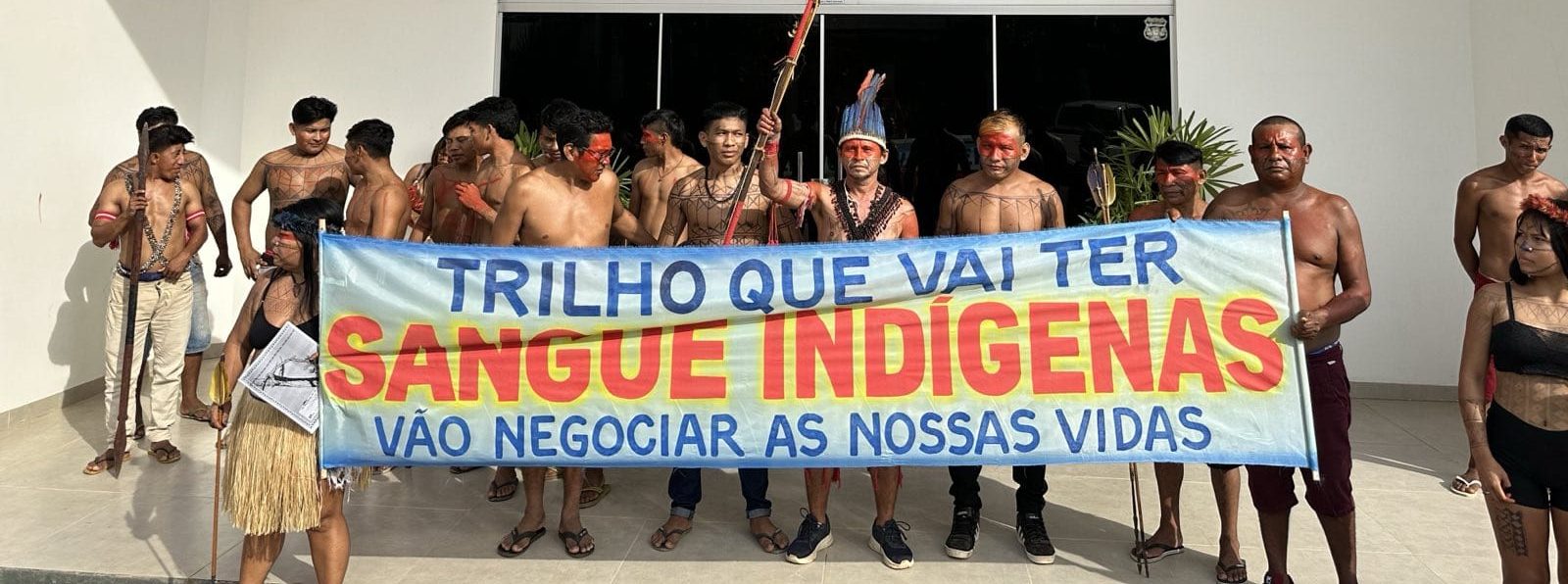 Só para Cargill, Bunge, ADM, Dreyfus, etc”; “Trilho que terá sangue indígena”; “Vozes do povo Apiaká do Médio Tapajós exigem respeito ao protocolo de consulta”.