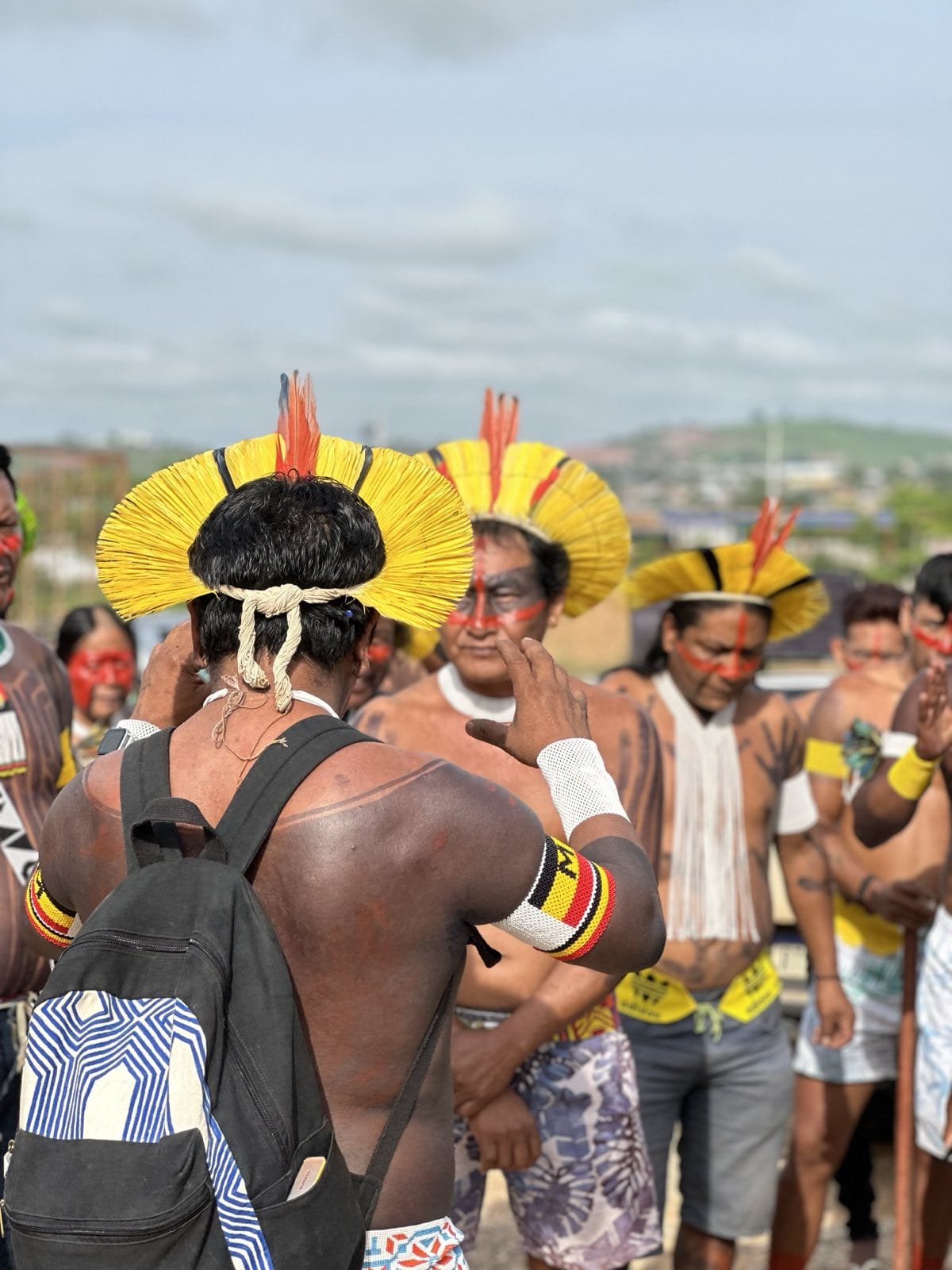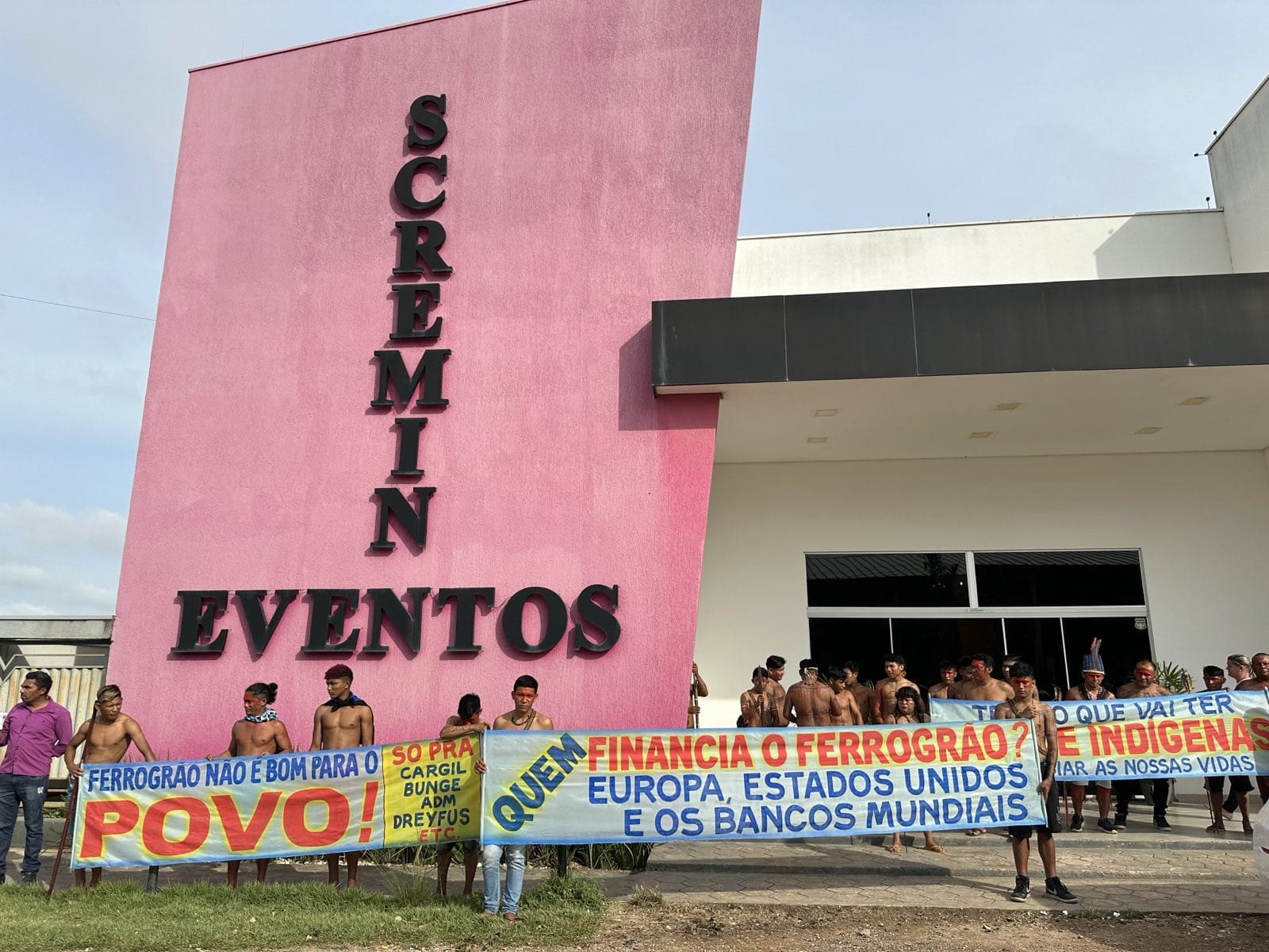 Os indígenas chegaram em frente ao local do evento às 9h, com faixas denunciando os impactos do projeto e da necessidade de cumprir os protocolos de consulta, com mensagens como: “Ferrogrão é a destruição da floresta e dos povos indígenas”; “Ferrogrão não é boa para o povo!