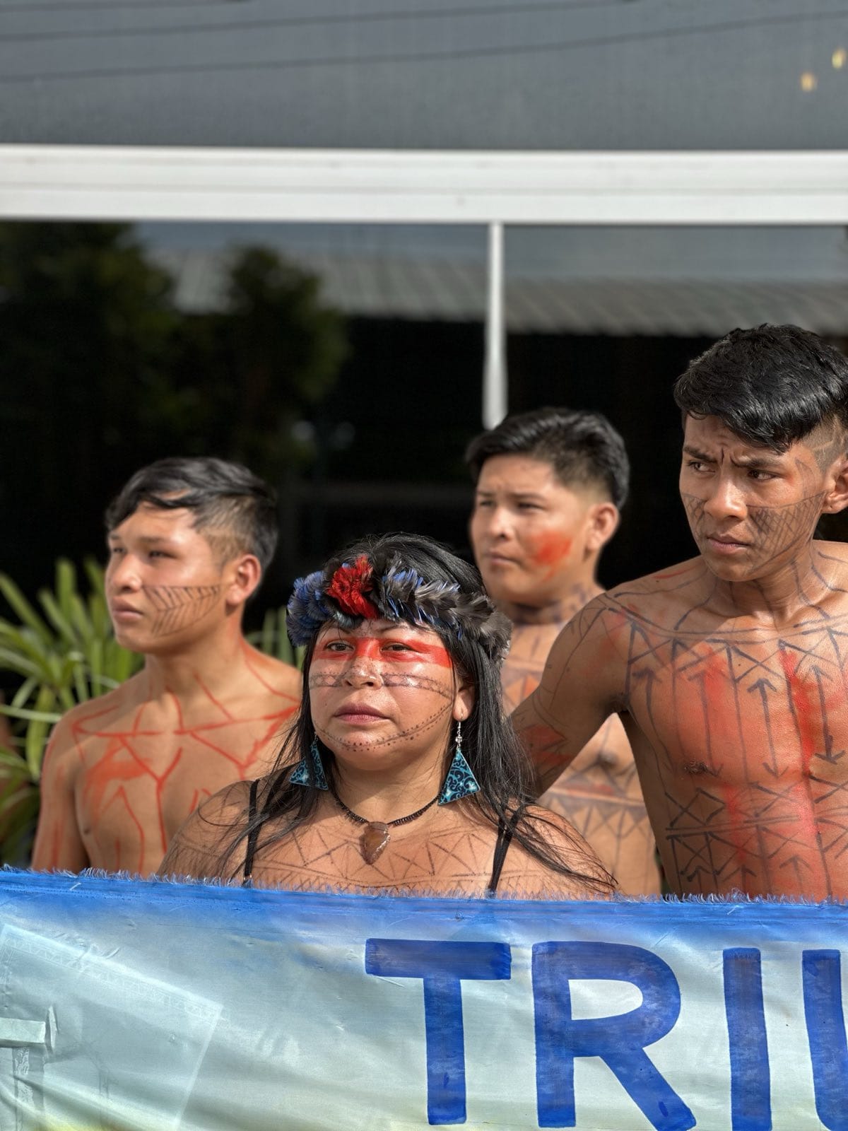 “Um dia depois da derrubada dos vetos ao Marco Temporal, este evento tenta legitimar um projeto que coloca em risco os povos da Amazônia e a própria floresta. Ele atropela os nossos direitos. Não ocorreu a consulta segundo os protocolos de cada povo, conforme estabelece a convenção 169 da OIT. Eles discutem destruir as nossas terras e não falam com a gente. Falam de megaprojetos, mas não falam de demarcação. Quem lucra com isso não é o povo, são as grandes empresas como a Cargill, Bunge, ADM, Dreyfus, etc. Estamos aqui protestando, porque a nossa preocupação é que sigam discutindo este projeto deixando os povos indígenas de lado”, afirma a liderança índigena Alessandra Munduruku.