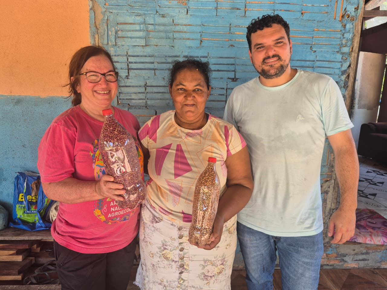 Meire segura as sementes de feijão cedidas pela FASE MT, ao lado de Cidinha Moura, coordenadora da FASE MT, e Robson Prado, educador popular da FASE MT.