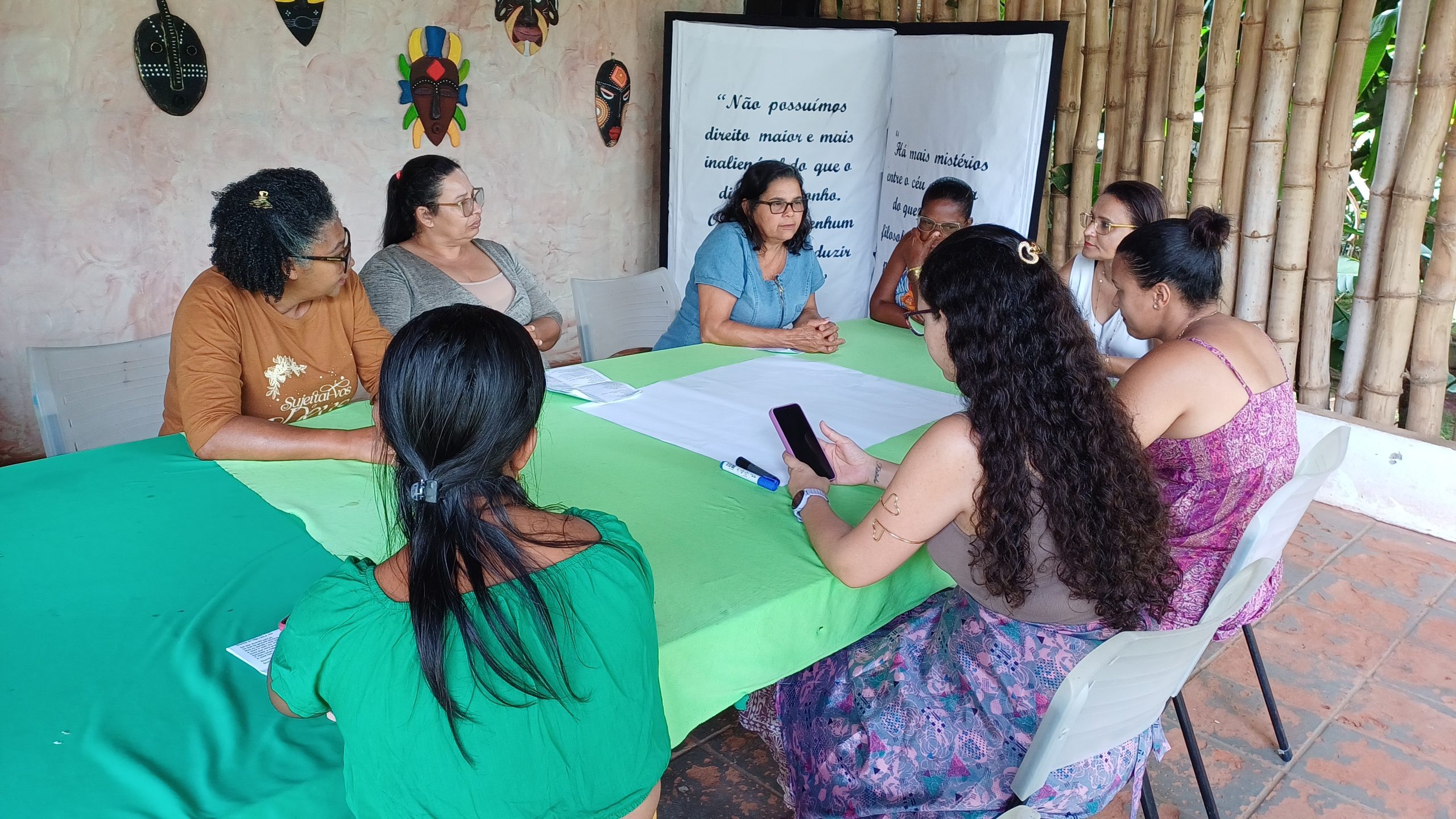 Em outro momento, elas puderam compartilhar informações sobre as políticas e serviços de enfrentamento à violência contra as mulheres no estado, identificando seu alcance e/ou insuficiência. Um exercício ainda foi a leitura de frases e expressões da nossa cultura que reproduzem a violência contra as mulheres e reflexão sobre elas com a pergunta: “o que nos indicam para o alcance das mudanças necessárias?”