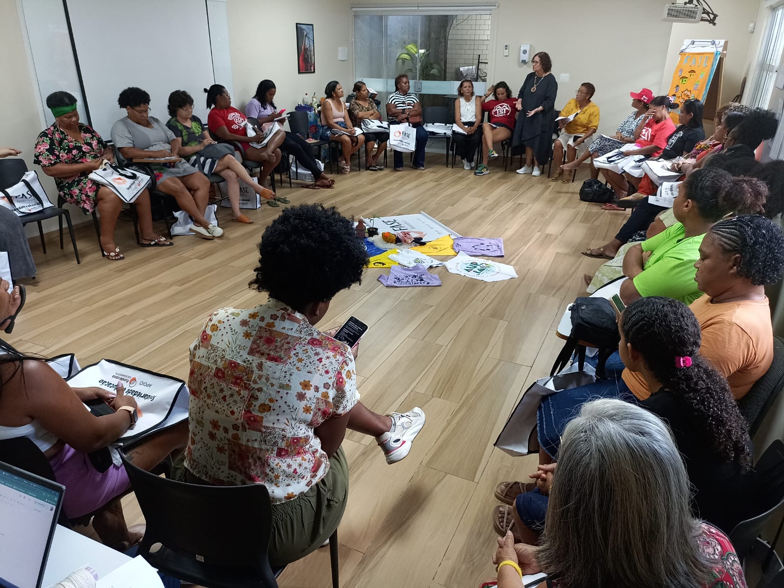 No mês de novembro, a FASE realizou seis seminários dedicados ao tema da violência de gênero, enfatizando a importância da causa das mulheres como sujeitos de direitos. Reunidas em roda, mulheres de grupos e coletivos da Bahia, Espírito Santo, Pará, Pernambuco, Mato Grosso e Rio de Janeiro, acompanhadas ao longo do ano pelas educadoras nos projetos que a organização realiza, participaram dos seminários promovidos pela FASE.
